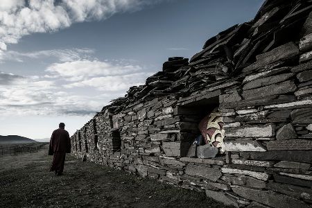 走近了,你會看見砌墻的石片上刻著密密麻麻的經(jīng)文;綿延的墻體上嵌著一個個窗口式的佛龕;每隔一段距離,石墻圍出一個回環(huán)的空間,類似于城墻上的烽火臺;長墻的兩端立著高大的佛塔,中段的108座佛塔排成長長的隊伍,和長墻并行。
