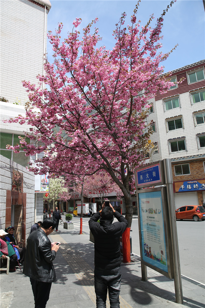 當春天遇見最美的櫻花時,驚艷了整個康定。櫻花與身邊人都將成為春日里的浪漫風景。櫻花之美,美在氣勢,櫻花紛飛,夢幻唯美。每年4月中旬,康定城北門的櫻花綻放后,人們像是約好了一樣聚集到這里,共赴這一場甜美盛宴。這一路繁花似錦,人們穿過枝椏花正盛的櫻花林,穿過粉色海洋,徑直奔向一個浪漫的童話,一路櫻花飄散,一路粉光燦爛。櫻花絢麗繽紛、陸續(xù)綻放,若恰逢一陣春風經(jīng)過,櫻花瓣隨風舞動,猶如紛落的雪花,空氣中浮動著櫻花特有的淡淡香氣,令人不禁懷疑自己置身夢境?!翱刀ǖ拇禾靵淼靡硪恍`放的櫻花,滿街的花草,折多河畔楊柳依依,康定的春天無比驚艷,醉了游人?!敝芟壬贿吪恼?,一邊感嘆,他在康定生活了40多年,20年前的康定,可以說找不到像樣的花草樹木,進入新時代,康定城市變美了,城市綠化走在了前面,城市的美譽度舒適度不斷提升??刀ㄖ海荷珴M園,姹紫嫣紅,風光旖旎。