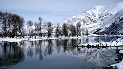還留在枝頭上的綠色已被簇簇白雪點綴著,銀色的薄霧一重一重,遠(yuǎn)處雪峰皚皚,冰川閃爍、青山融融、波光粼粼。