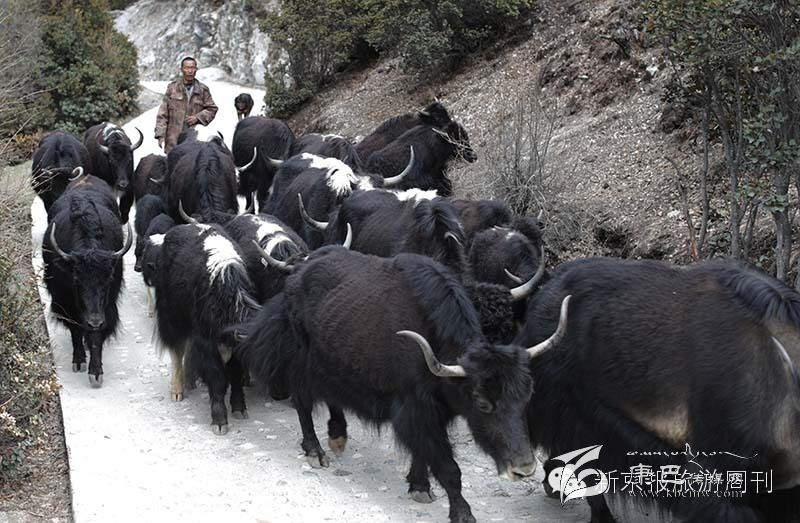 景區(qū)路上常有牧民趕著牦牛經過。這里居住著很多藏族居民。![]()