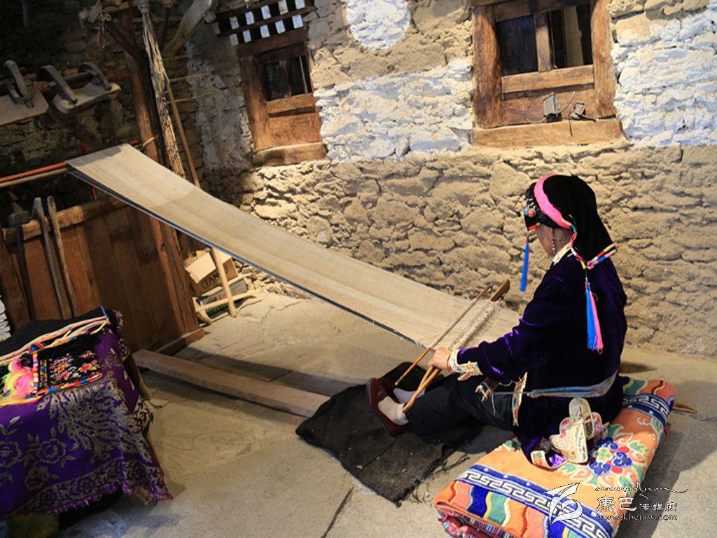 穿過古樸的大門,步入館中,映入眼簾的是古老的民間紡織技藝。一位藏族老阿媽端坐在古董般的織布機(jī)前,聚精會(huì)神地編織布匹,見到游人微笑回應(yīng),并未停下她手上的工作。年逾60的擁天秀,從十幾歲便學(xué)習(xí)織布,此間從未間斷。隨著紡織機(jī)逐漸被淘汰,擁天秀已成為傳承這門古老技藝的“活化石”。非遺展示館開館時(shí),擁天秀主動(dòng)表示,愿在此地免費(fèi)為游客展示丹巴紡織技藝。 “我喜歡丹巴刺繡和紡織工藝,平時(shí)在家里也會(huì)做,現(xiàn)在眼睛不很好,所以刺繡沒有辦法做了。游客們很喜歡在這里看我織布,他們有什么問題,我都會(huì)給他們講解。”古老的嘉絨紡織技術(shù),通過擁天秀的雙手,漸漸被人們熟知,無(wú)數(shù)張游人與她的合影也被傳至網(wǎng)絡(luò)。經(jīng)她現(xiàn)場(chǎng)紡織,價(jià)值600元一匹的純手工布銷量也節(jié)節(jié)攀升,擁天秀研習(xí)多年的手工活在展示館中終于有了“用武之地”。