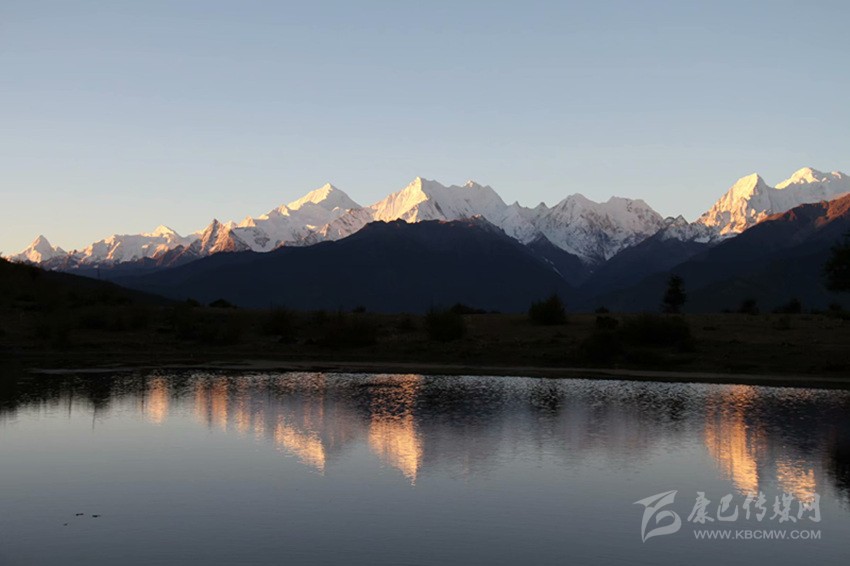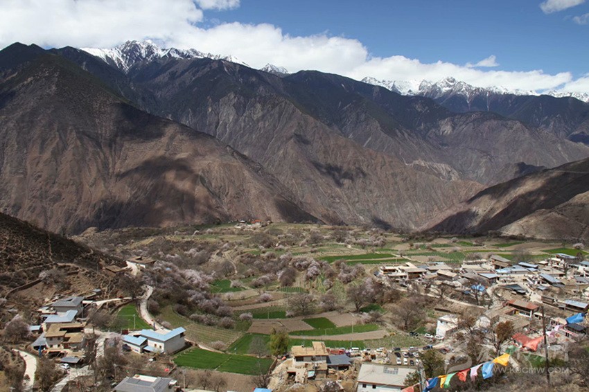 我和張柯在村子里轉(zhuǎn)悠了十多分鐘,也沒有見到一個(gè)人。我們只好到田野里瞎轉(zhuǎn)。斜達(dá)村的海拔有3305米,在這里可以俯瞰下面山谷對(duì)面的江坡村。因?yàn)楹0胃?,種的都是旱地,地里的青稞才有一尺高。我們從田埂上走過去,一只碩大的母雞帶著10多只小雞唧唧咕咕的在田地里覓食。我們走到村邊山頭上,放眼望去,對(duì)面的卡瓦格博群山放射著萬道金燦燦的霞光,盡顯山之王者的威儀。下面的山谷里,蘭色的炊煙如帳幔般飄拂,好一副山野美景!