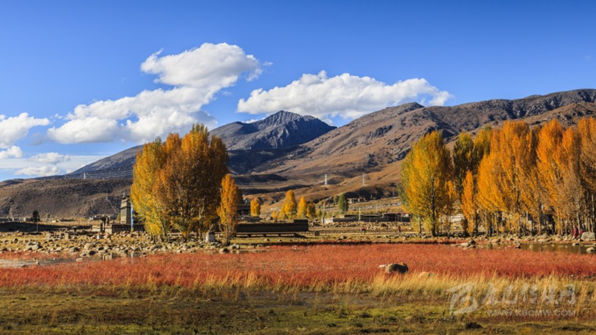生活的美好在萬(wàn)畝格?;ê@?、在山溝溝里巨大的秋陽(yáng)灑落我周身的溫暖里、在公路兩旁的蓮花白緊實(shí)的菜心里,美好的日子是公路旁小木臺(tái)上擺滿的橢圓黃色,青黃的蘋果,一袋袋牦牛肉干、筍黃色南瓜里,美好在萬(wàn)萬(wàn)棵果樹(shù)、白楊樹(shù)、柳樹(shù)林間。美好是阿媽高原紅的臉蛋兒透出血紅色的笑臉。