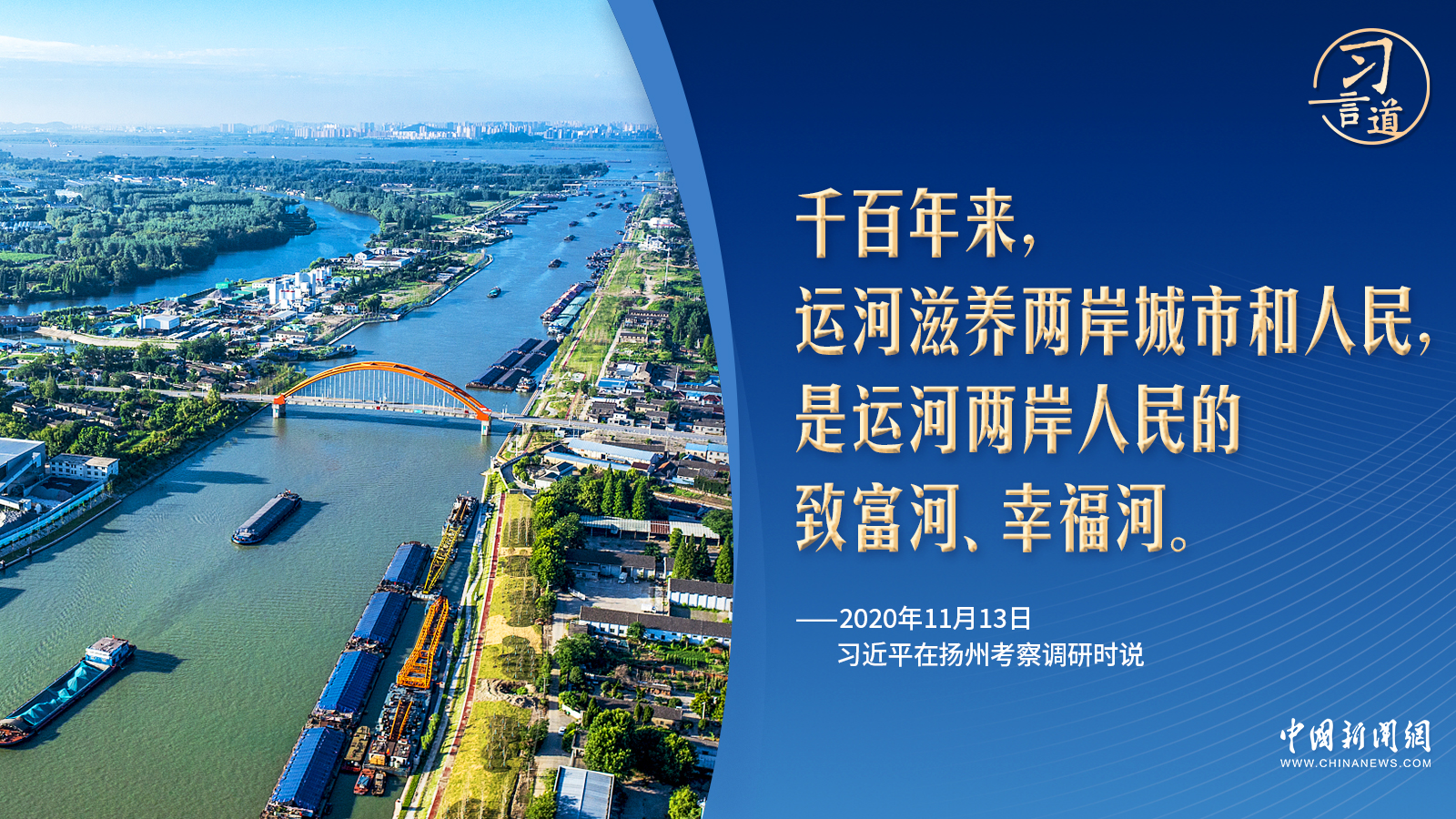 “千百年來,運(yùn)河滋養(yǎng)兩岸城市和人民,是運(yùn)河兩岸人民的致富河、幸福河?!?020年考察揚(yáng)州運(yùn)河三灣生態(tài)文化公園時(shí),習(xí)近平一句“致富河、幸福河”指出了運(yùn)河保護(hù)的更深意涵。