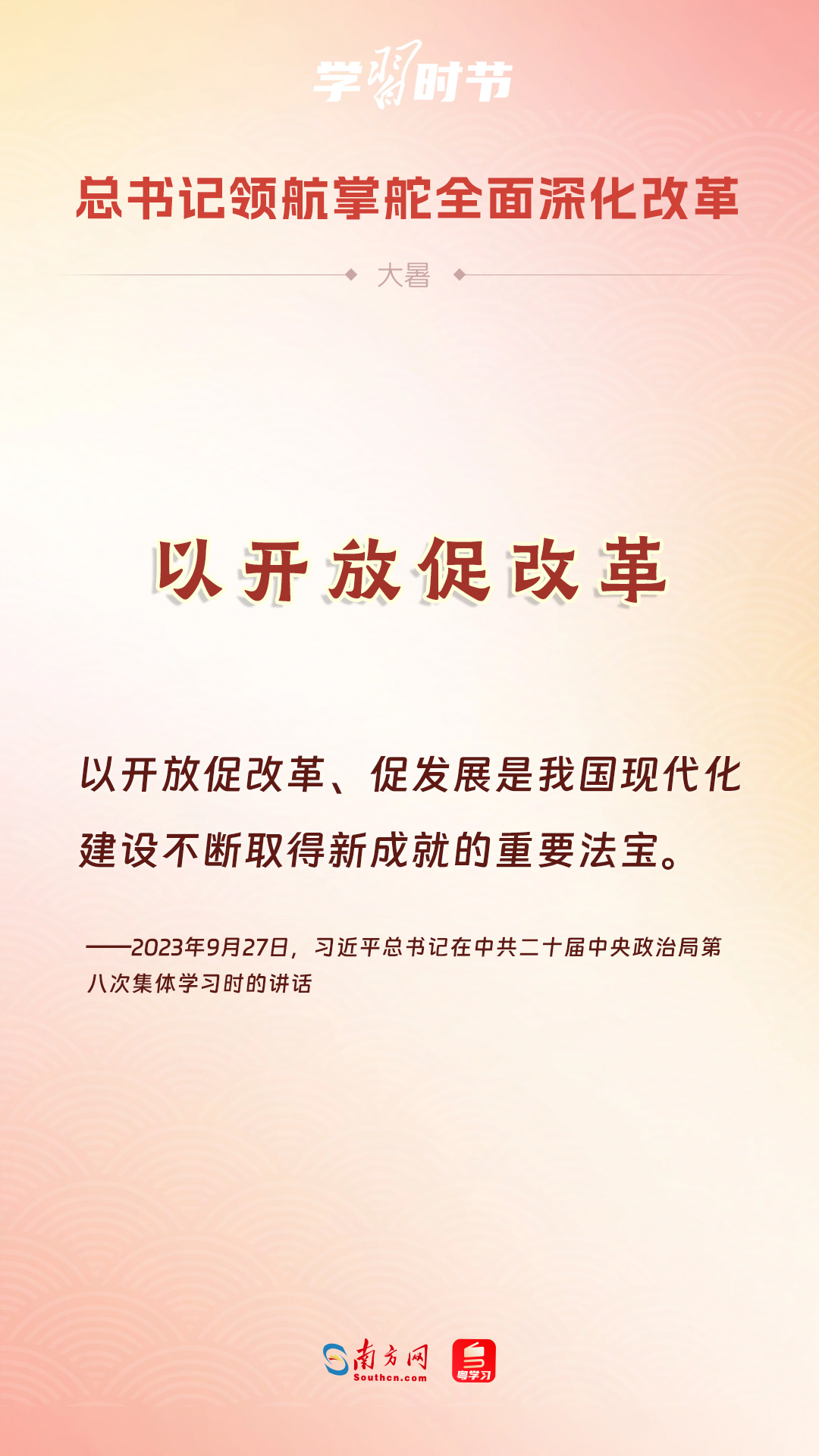 黨的十八大以來(lái),習(xí)近平總書(shū)記親自領(lǐng)導(dǎo)、親自部署、親自推動(dòng)全面深化改革工作,推動(dòng)全面深化改革事業(yè)在攻堅(jiān)克難中不斷邁上新臺(tái)階、取得新勝利。在驕陽(yáng)似火的大暑時(shí)節(jié),通過(guò)一組海報(bào),讓我們共同學(xué)習(xí)習(xí)近平總書(shū)記關(guān)于“全面深化改革”的重要論述。