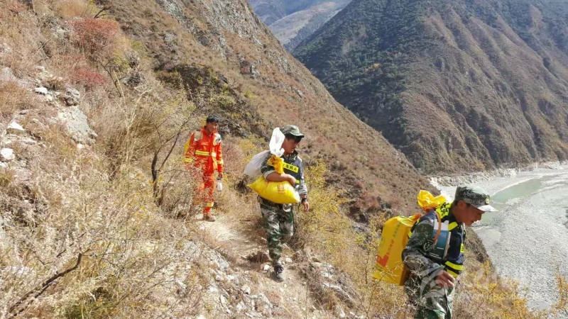 車輛無法前行,白玉縣民兵以及相關(guān)應(yīng)急隊(duì)伍將救災(zāi)物資順著小路背上現(xiàn)場(chǎng)