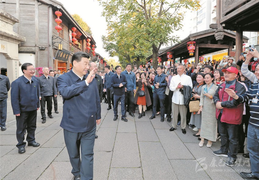 習近平在福州三坊七巷歷史文化街區(qū)考察時,向游客和市民招手致意。
