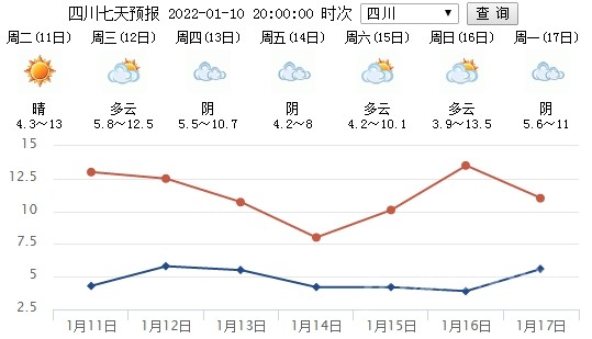 今天白天到晚上,盆地大部陰天間多云,其中巴中、南充、綿陽、遂寧4市部分地方和西部沿山有零星小雨;甘孜州西北部、東南部,阿壩州南部及涼山州東北部多云間陰有分散陣雨雪(雨),川西高原和攀西地區(qū)其余地方多云間晴。24小時(shí)內(nèi),盆地最高氣溫11~14℃;最低氣溫:北部1~4℃,南部4~7℃。