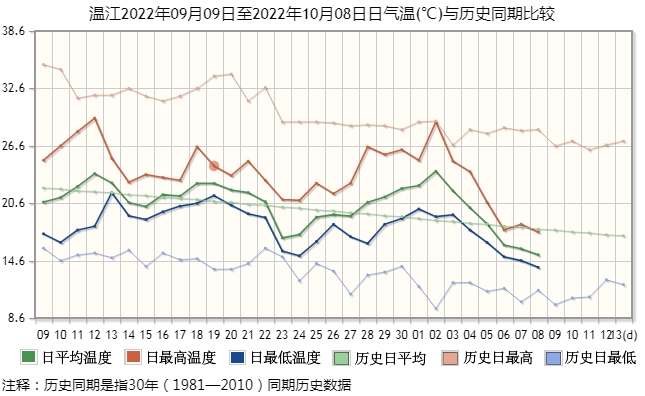 在盆地區(qū),溫江國(guó)家氣象站的觀測(cè)顯示,10月2日以來(lái),當(dāng)?shù)氐娜掌骄鶜鉁亍⑷兆罡邭鉁?、日最低氣溫都是一路快速下行,使前期偏高的氣溫向著歷史均值快速回歸。
