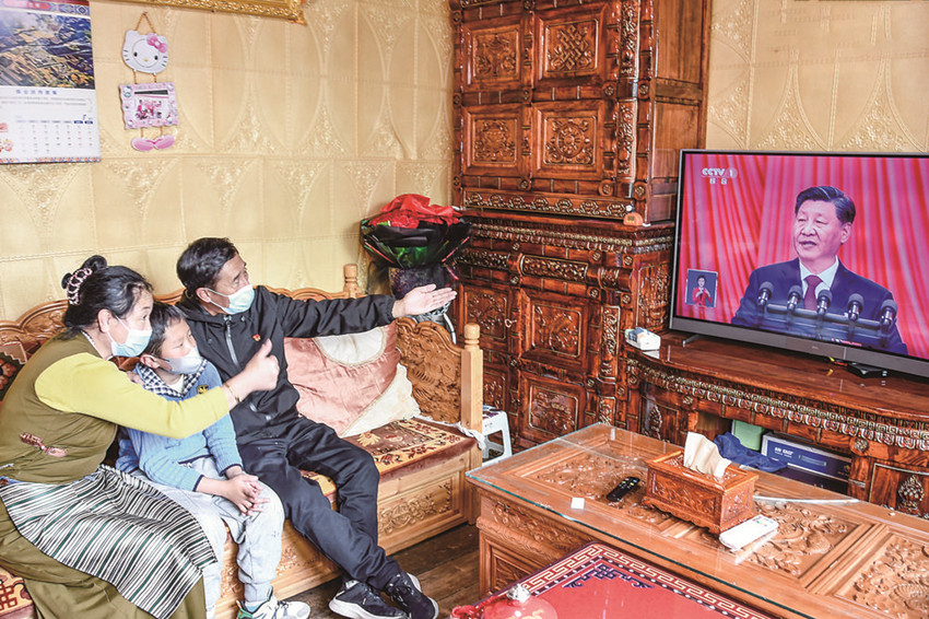 理塘縣高城鎮(zhèn)珍呷村洛絨青繞一家收看黨的二十大開(kāi)幕會(huì)。