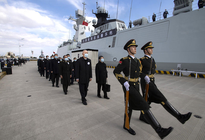 中國人民解放軍海軍揚州艦伏波靜臥,艦上官兵分區(qū)列隊、肅立舷邊。揚州是江澤民同志的故鄉(xiāng)。今天,這艘以揚州命名的軍艦,以最高禮儀送別這位為黨和人民建立了不朽功勛的卓越領(lǐng)導人。江澤民同志的親屬捧護著骨灰登上揚州艦。海軍笛吹響,儀仗隊持槍肅立,行注目禮。當揚州艦起航時,軍港內(nèi)所有艦船汽笛長鳴,響徹云霄。