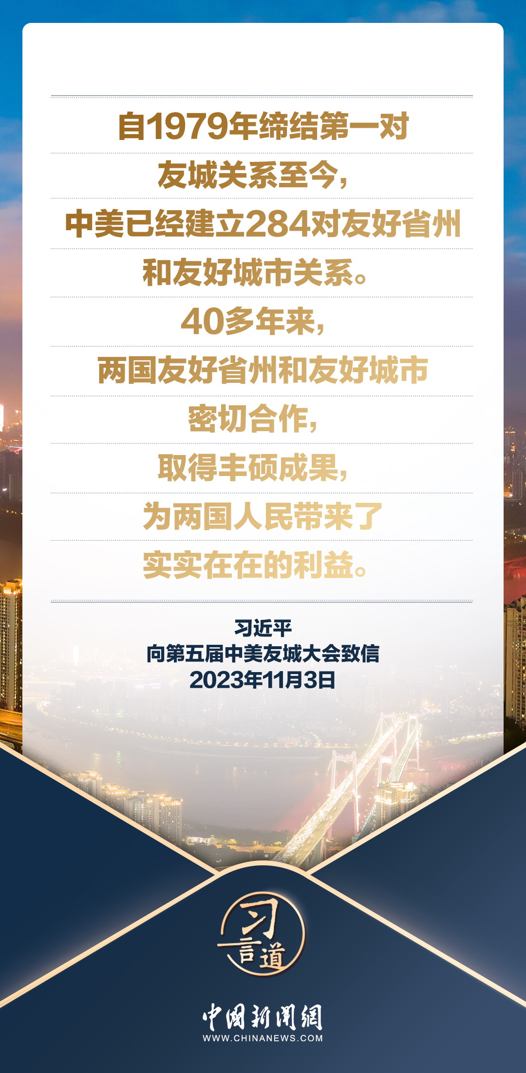11月3日,國(guó)家主席習(xí)近平向第五屆中美友城大會(huì)致信。習(xí)近平指出——