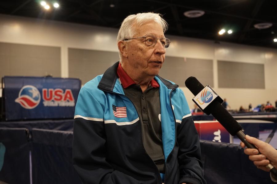 ??2023年12月16日,中美“乒乓外交”親歷者戴爾·斯威里斯在2023年美國乒乓球公開賽老年組比賽間隙接受新華社記者專訪。