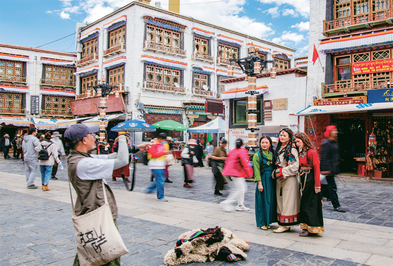 千年八廓街,見證民族團結(jié)。2021年7月,習(xí)近平總書記來到位于西藏拉薩老城區(qū)的八廓街,感慨地說:“千年八廓街,是我們各民族建起來的八廓街。各民族文化在這里交流交往交融,我們中華民族的大家庭在這里其樂融融?!眻D為2023年6月13日,游客身著藏裝在八廓街拍照留念。 新華社記者 姜帆/攝