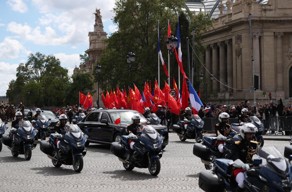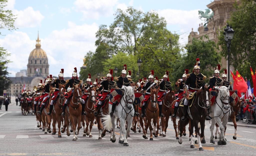 ??歡迎儀式后,習(xí)近平和夫人彭麗媛在共和國(guó)衛(wèi)隊(duì)148名騎兵組成的禮兵馬隊(duì)和摩托車隊(duì)護(hù)衛(wèi)下,乘車前往愛麗舍宮。