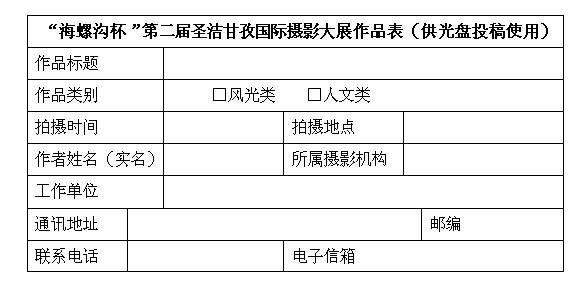 光盤(pán)包裝盒上注明大展名稱,每幅作品文件名處注明作品標(biāo)題,同時(shí)提供作者資料及作品信息(word文檔)。投稿作品為jpg格式,圖片統(tǒng)一處理為長(zhǎng)邊600—1000像素,文件大小控制在500KB以內(nèi)。無(wú)相關(guān)資料的作品,主辦單位有權(quán)取消其參評(píng)資格。作品以光盤(pán)(CD—R或DVD—R)形式郵寄至: