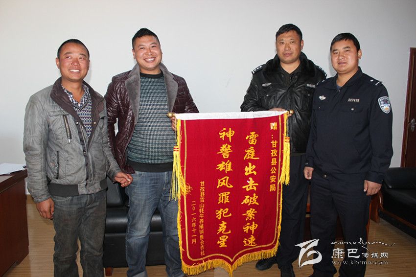 本網(wǎng)訊(余應(yīng)瓊 文/圖)11月11日,甘孜縣雪山牦牛養(yǎng)殖銷(xiāo)售合作社負(fù)責(zé)人鄭萬(wàn)強(qiáng)將一面繡有“雷霆出擊破案神速 神警雄風(fēng)罪犯克星”的錦旗送到縣公安局,表達(dá)對(duì)公安干警迅速破案,幫助貧困群眾挽回經(jīng)濟(jì)損失的感激之情。