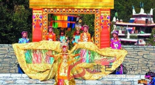 在催人奮進的戰(zhàn)鼓聲中,一群身披甲胄的士兵拿著長劍,背著巨弓走到臺前,在鏗鏘的戰(zhàn)鼓聲中,戰(zhàn)士們做著各種競技動作,模仿武士們互相攻擊的樣子,那矯健的身影展示了遠古時代嘉絨藏族先民們?yōu)榱松媾c自然努力抗爭的場景。過了一會兒音樂一轉(zhuǎn),戰(zhàn)鼓聲漸漸減弱,在鳥雀的陣陣啾啾聲中,一座木門慢慢的開啟,一位身披長袍、頭戴鳳冠的女王在眾多美女的簇擁下,緩緩走下臺階步入舞臺中央,此時,一位手捧托盤的老者來到女王面前單膝下跪,將托盤高舉過頂,并邀請女王品嘗佳肴,女王將中指在酒中蘸了蘸,并曲起中指向四周輕輕彈去,寓意愿將杯中美酒與四方百姓同飲。在女王面前還放置著一個凈水桶,桶中盛滿了清澈的甘泉,桶上橫放著一枝柏樹枝,女王伸出纖纖玉手,拿著柏樹枝在水中蘸了蘸,面向墨爾多神山撒去,寓意向神山祈福。這是此次《美人谷·丹巴》節(jié)目展演中的序曲部分,有著強烈的東女神韻,將遠古時代東女國女王遺風展演的淋漓盡致。
