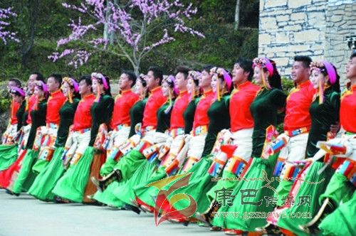 10月26日,在甲居藏寨,處處洋溢著豐收和歡樂的氣氛,人們扶老攜幼,身著節(jié)日的盛裝走到一起,來共同慶祝丹巴嘉絨風情節(jié)的順利召開。在一塊空地中,搭建了臨時的舞臺,看臺上,幾座古碉模型傲然挺立,在不遠處,一座古碉矗立在一座小山包上,與古碉模型遙相呼應(yīng)、相映成趣。上午9時40分,當節(jié)目主持人宣布嘉絨風情節(jié)正式開始時,一束束搖曳的煙花向空中飛去,在空中炸響后,散發(fā)出五顏六色的煙霧,其中有的還幻化成幾多小小的降落傘,就像多多盛開的鮮花在空中綻放。演出現(xiàn)場前的大地和遠處的小山坡上到處都站滿了熱情的觀眾,合著禮花的爆裂時的響聲,將手中的小紅旗展開,高舉過頭頂,有節(jié)奏的左右搖動,霎時間,整個現(xiàn)場成為了紅色的海洋。
