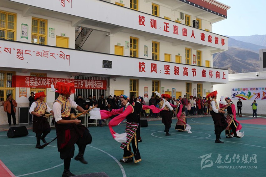 上午11點(diǎn),歡快的音樂(lè)在小學(xué)操場(chǎng)上響起,演出正式開(kāi)始。村民們圍坐在操場(chǎng)上,人頭攢動(dòng)、彩幡飛舞、陽(yáng)光正好。13個(gè)節(jié)目依次上演,包括男女群舞、女子群舞、男子合唱、女子合唱、男女獨(dú)唱,最有特色的是得榮本地特色群舞《雪域鍋莊》和《九步情》。