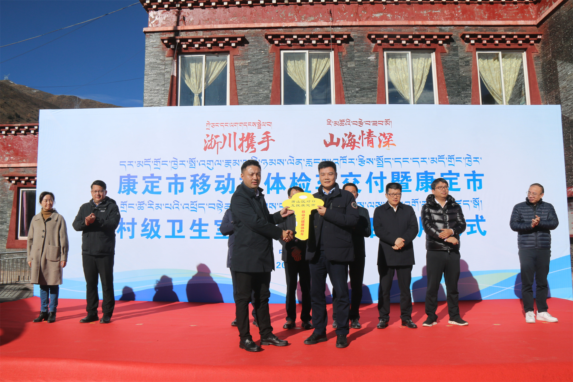 圖為杭州市蕭山區(qū)對口支援康定市移動式健康體檢車暨康定市“鄉(xiāng)村振興醫(yī)療發(fā)展計劃(村衛(wèi)生室提升改造)”項目交付儀式。