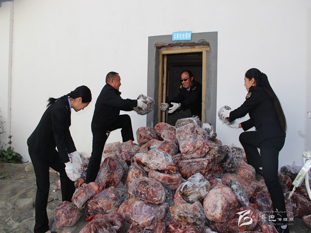 本網(wǎng)訊(周燕 魏麗雯 文/圖)11月17日,康定市在姑咱鎮(zhèn)屠宰場(chǎng)無(wú)害化處理間對(duì)今年4月份以來(lái)開(kāi)展的牦牛肉市場(chǎng)專(zhuān)項(xiàng)整治活動(dòng)中查獲的2000余公斤來(lái)源不明的問(wèn)題牛肉進(jìn)行集中銷(xiāo)毀。
