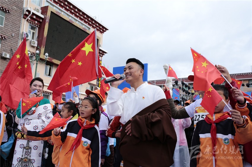 在開幕式上,藏族男女飽含真情領(lǐng)唱《歌唱祖國》,緊接著,托舉五星紅旗的儀仗隊緩緩進場。當雄壯的《義勇軍進行曲》響起,跑者、老師、學(xué)生、干部、農(nóng)牧民群眾等向冉冉升起的國旗行注目禮,心里升騰起無比的自豪。