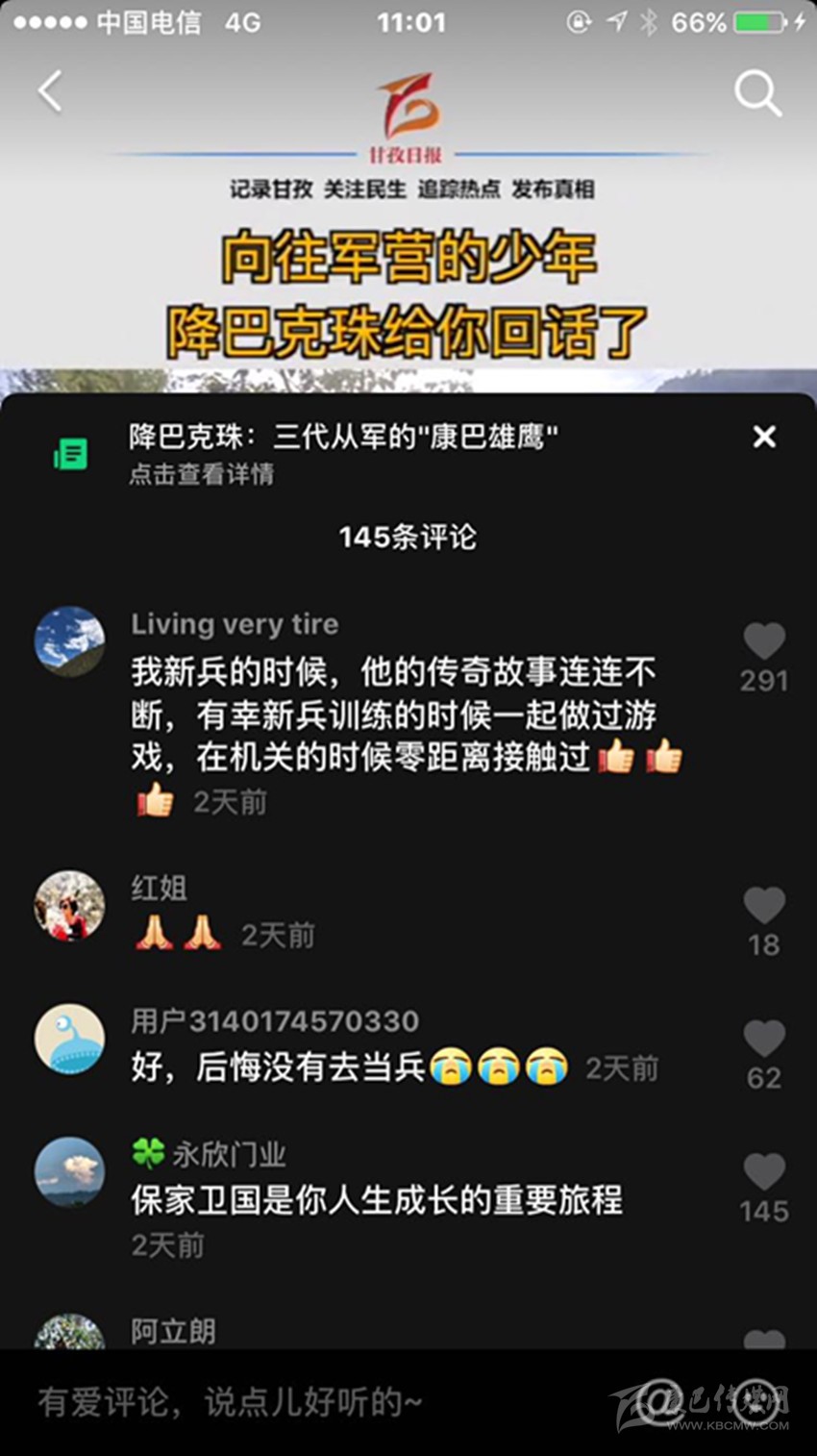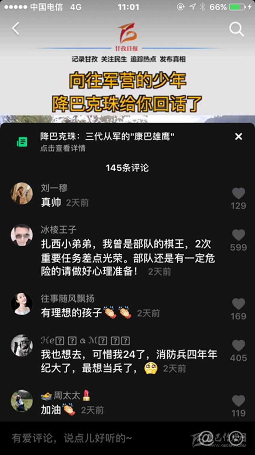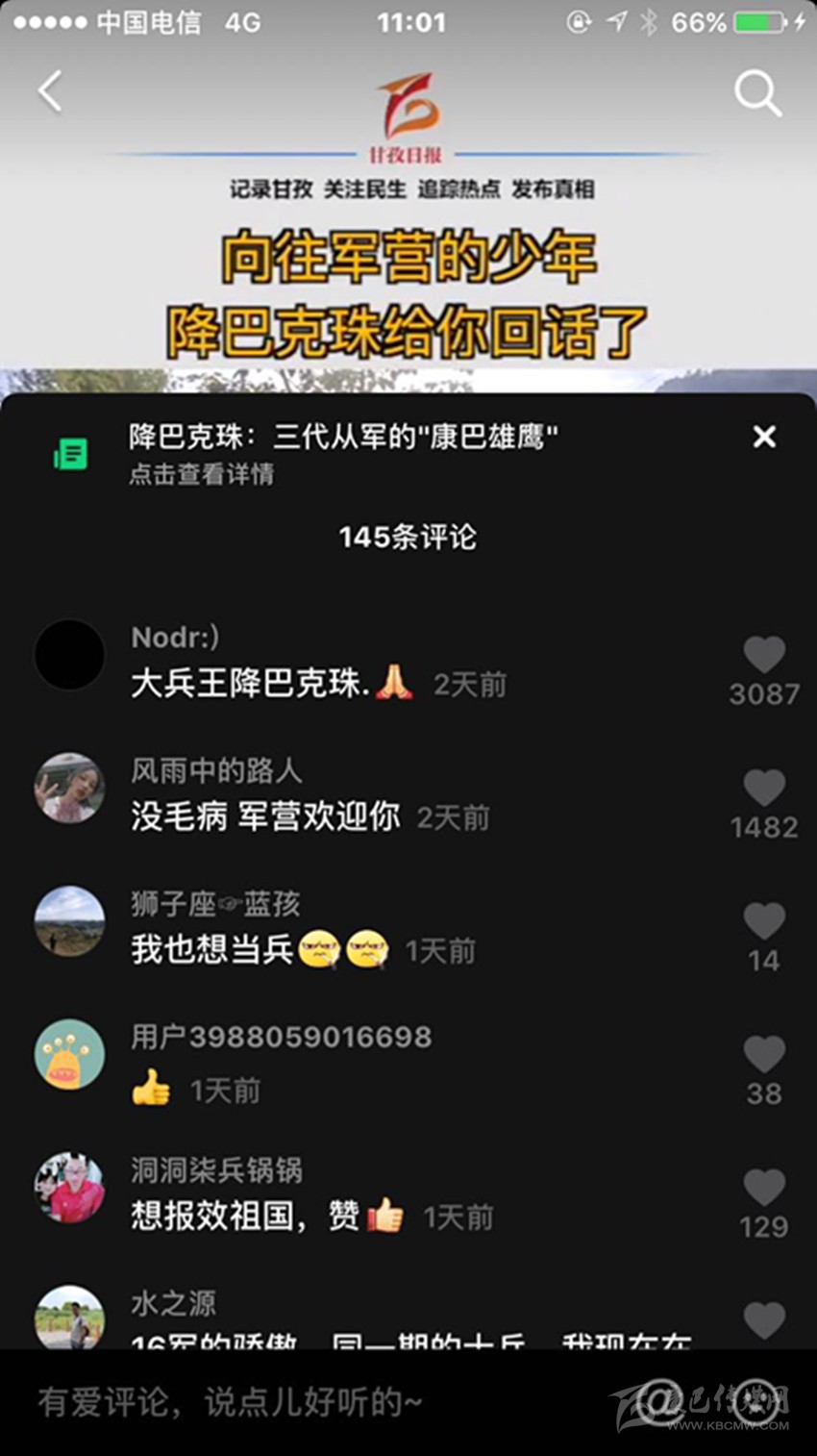 三段視頻,六百多條留言,近兩千萬次播放,一個(gè)藏族少年的軍旅夢(mèng)在網(wǎng)絡(luò)上熱烈綻放,而農(nóng)牧區(qū)許多青年的軍旅夢(mèng)也就此被點(diǎn)燃,忠勇大愛的“血脈”在康巴高原傳承! (本網(wǎng)記者 肖宵 整理)