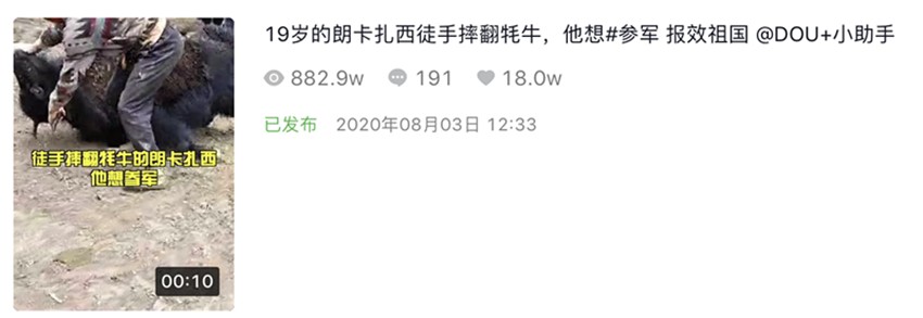 8月3日,這段僅有10秒長(zhǎng)的視頻,在抖音短視頻平臺(tái)《甘孜日?qǐng)?bào)》康巴傳媒抖音號(hào)發(fā)布后,短短一天內(nèi)獲得了800多萬次播放量,200多名網(wǎng)友留言評(píng)論,18萬次點(diǎn)贊更是“宣告”其正式成為“網(wǎng)絡(luò)爆款”。