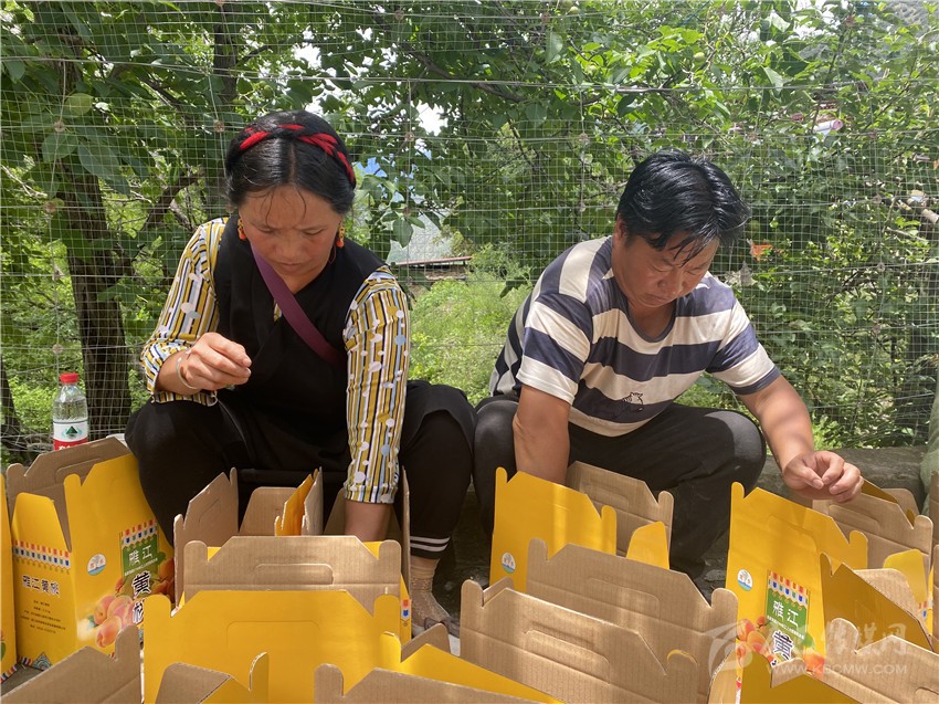 村民正在對黃桃進行統(tǒng)一打包裝箱。