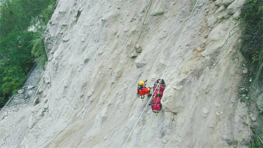 9月7日18時(shí)許,救援人員從海螺溝景區(qū)將一位受傷群眾用擔(dān)架運(yùn)出。因景區(qū)通往磨西鎮(zhèn)的主干道還在搶通中,救援人員采取吊繩、拖拉的方式,將受傷群眾從斷道處向上運(yùn)送到落差一百多米的安全處,再由等候的救護(hù)車運(yùn)送至醫(yī)療點(diǎn)。四川日?qǐng)?bào)全媒體記者 吳聃 攝