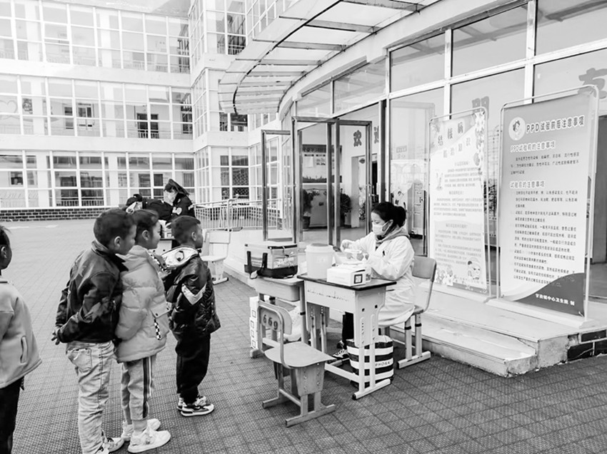 圖為醫(yī)護人員到學校開展預防接種工作。