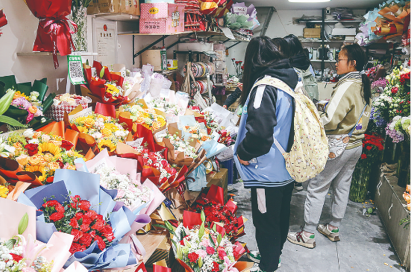學(xué)生在愛(ài)花居花店為母親選購(gòu)鮮花。