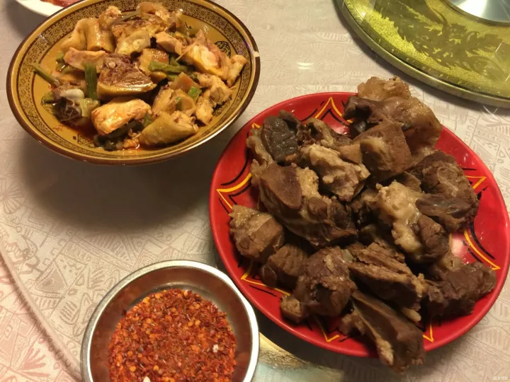 藏族同胞好將牛羊肉大塊入鍋大火煮之,剛過心則撈起。吃時手抓刀削入口,謂之手抓砣砣內(nèi)。冷熱食皆佳,肉嫩味鮮?,F(xiàn)在迎合大眾口味,有些用炒,有些用烤,蘸著海椒面,味道簡直美味極了。