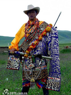 吐蕃時(shí)期   藏族服飾文化有了較大的發(fā)展。"中二丁王"時(shí)(相當(dāng)于中原西漢中期),南方雅隆河谷的吐蕃開(kāi)始了冶煉鐵、銅、銀等礦產(chǎn),為金屬飾品的出現(xiàn)創(chuàng)造了條件。藏史記載,公元三世紀(jì)的拉妥妥日年贊時(shí),吐蕃贊普的服飾巳與眾不同,出現(xiàn)了服飾等級(jí)的差異。史載松贊干布時(shí)期,吐蕃的歷史翻開(kāi)了新的一頁(yè),吐蕃文化得到迅速的發(fā)展,其服飾文化日漸發(fā)達(dá)。吐蕃奴隸制王朝等級(jí)森嚴(yán),在服飾上的表現(xiàn)也日臻完備。從反映吐蕃盛時(shí)的敦煌壁畫(huà)可看出,君臣服飾的等級(jí)差異,藏王一般只有贊普才能使用的三瓣寶冠箍住的有凹槽裝飾的無(wú)沿帽,呈紅色,通常高于一般人的帽子;藏王的侍從或臣下往往戴平頂無(wú)沿帽。衣袍的式樣也各有不同,官吏的章飾規(guī)定有一等瑟瑟,二等金,三等金包銀,四等銀,五等銅,六等鐵等大小兩類,共十二級(jí),裝在方圓三寸的盒子里掛在胸前,以區(qū)別職位的高低。武將的頭盔有形如塔的裝飾,戰(zhàn)士頭盔上有三只彩旗以表示出生的年月,隨著"惟以淬礪為業(yè)"的吐蕃冶煉業(yè)的發(fā)展,軍隊(duì)的鎧胄日趨精良,有的周身僅露兩個(gè)眼窩,勁弓利刃常不能破,其威嚴(yán)、勇猛之氣在今天大昭寺壁畫(huà)的吐蕃武士像中尚歷歷在目。吐蕃貴族不僅本人穿著華貴,還在聚會(huì)宴客時(shí),把傭人裝飾起來(lái)。而作為贊普的松贊干布則用一種紅帶子包頭,身著長(zhǎng)袍,足穿腳尖朝上的靴子,據(jù)《紅史》載,這種王服是受波斯王朝的影響,反映了文化交往已影響到了服飾文化層次,而從松贊干布伊始的吐蕃與中原的密切交往,兩種民族文化的長(zhǎng)期接觸更為藏族服飾的發(fā)展注入了新鮮血液。史載文成公主進(jìn)藏時(shí),帶入諸種花緞、錦、綾羅與諸色衣料二萬(wàn)匹,還有大量的金玉器具。松贊干布及吐蕃大臣紛紛自行去掉氈裘,改穿絹綺。近代西藏的高級(jí)官吏,頭發(fā)綰成一髻,戴金翅白紗帽,這是唐代進(jìn)士的服飾。此外,還采納文成公主建議,令國(guó)人禁止"赭面"(用油涂面),文成公主進(jìn)藏還帶來(lái)了種植蠶桑和紡織技術(shù),"植??椊z兮"大大的促進(jìn)了吐蕃服飾技藝的發(fā)展,青海海西州都蘭出土的大批吐蕃服飾文物,真實(shí)、生動(dòng)地反映了吐蕃服飾的工藝水平。服裝的織物紋樣多為聯(lián)珠動(dòng)物紋,裝飾品的金質(zhì)首飾、佩飾的精美使人嘆為觀止。今天藏族婦女飾品的鑲嵌形制,可以從這些文物中找到原型。斯坦因的《古代中亞文化遺跡》一書(shū)也曾提到:"在吐蕃發(fā)現(xiàn)的遺物中,有很多具有花紋的絲織物,花紋中有些是印的,有些是織的,花紋圖象的變化很多,這一點(diǎn)很可以表示吐蕃商業(yè)的地位,……大概是中國(guó)與西亞之間的貿(mào)易重點(diǎn)。"頻繁的交往促進(jìn)了吐蕃經(jīng)濟(jì)的發(fā)展,也促進(jìn)了服飾文化的發(fā)展。 吐蕃是一個(gè)軍事帝國(guó),在它的發(fā)展過(guò)程中征服融合了青藏高原及其邊緣地區(qū)的許多其他民族,這是造成今天各地區(qū)藏族之間文化差異的重要原因。在服飾的表現(xiàn)上也是如此。吐蕃時(shí)代這種差異主要表現(xiàn)為東女、附國(guó)、黨項(xiàng)等部落服飾的不同,東女部落住在康延川(今昌都),處于母系氏族社會(huì)發(fā)展階段,其女王穿青毛綾(氆氌)裙,上披青袍,袖長(zhǎng)到地,冬穿用文錦裝飾的羔裘。發(fā)作鬟髻狀,兩耳垂珰(耳環(huán))。足穿革素(皮靴)。一般男子披發(fā),婦女辨發(fā),男女都用彩色涂面。王死居喪三年,不易服,不梳洗。附國(guó)是以今四川甘孜為中心,包括今四川阿壩一帶的嘉絨藏人的藏羌融合體。他們頭戴圓形皮帽,或帶幕離佳(即面罩一類飾物,為婦女所帶)。身披毛曷毛(氆氌一類)、皮裘,穿牛皮鞋。頸系鐵索,手貫鐵釧。王與酋長(zhǎng)以金為首飾,胸前掛著三寸長(zhǎng)的金花。黨項(xiàng)則是純游牧部落,"服氈襲褐,披氈以為上飾",早在北周時(shí)巳能制造精美的犀甲、鐵鎧。四川西北部還有屬黨項(xiàng)部落聯(lián)盟的鄧至、武興國(guó)和宕昌等,服飾習(xí)俗為頭藏烏皂突騎帽,身穿長(zhǎng)袍,下著小口褲、足穿皮靴,與今四川牧區(qū)藏族服飾相似。此外青海地區(qū)有吐谷渾,貴婦人披錦袍,戴金花冠。如女發(fā)型為辨發(fā)披于后,后飾珠貝,以繁多為高貴,這一服飾與今青海藏族婦女大致相同。這些地區(qū)服飾特征是今天各地不同藏族服飾的母型。 吐蕃王朝崩潰后,從九世紀(jì)中期到第十一世紀(jì)的二百余年間,西藏社會(huì)一直處于分裂割據(jù)的混亂狀況。這一時(shí)期戰(zhàn)亂不堪,服飾藝術(shù)的發(fā)展也難免厄運(yùn),停滯不前,而與戰(zhàn)爭(zhēng)有關(guān)的武士服飾卻濟(jì)時(shí)發(fā)展。在西藏阿里古格王國(guó)的遺址中,發(fā)掘有大量古代武士的盔甲和武器。其鎧甲多為鋼片甲,是用細(xì)皮條串結(jié)鋼片而成,串結(jié)方法頗為復(fù)雜,武器中的盾牌,系用藤條編織為圓形,直徑八十厘米,正面鑲有銅質(zhì)加固件,銅件上雕刻有細(xì)密的紋飾,故亦可謂是銅飾件,背面有四個(gè)銅環(huán),環(huán)間可用皮條相連,作握柄之用,無(wú)論這些服飾和兵器,是西藏本地生產(chǎn),還是外來(lái)流入,都說(shuō)明其時(shí)西